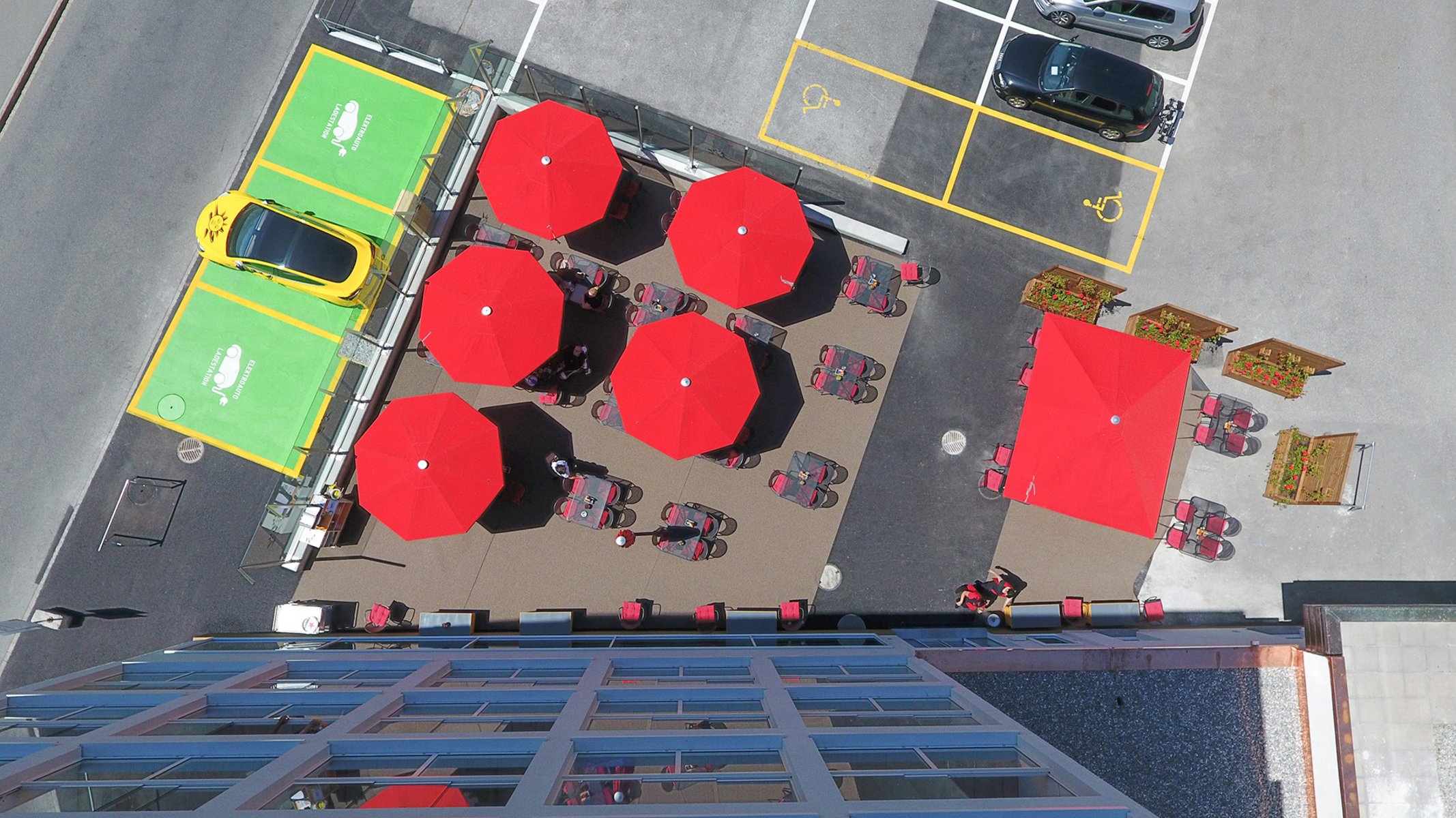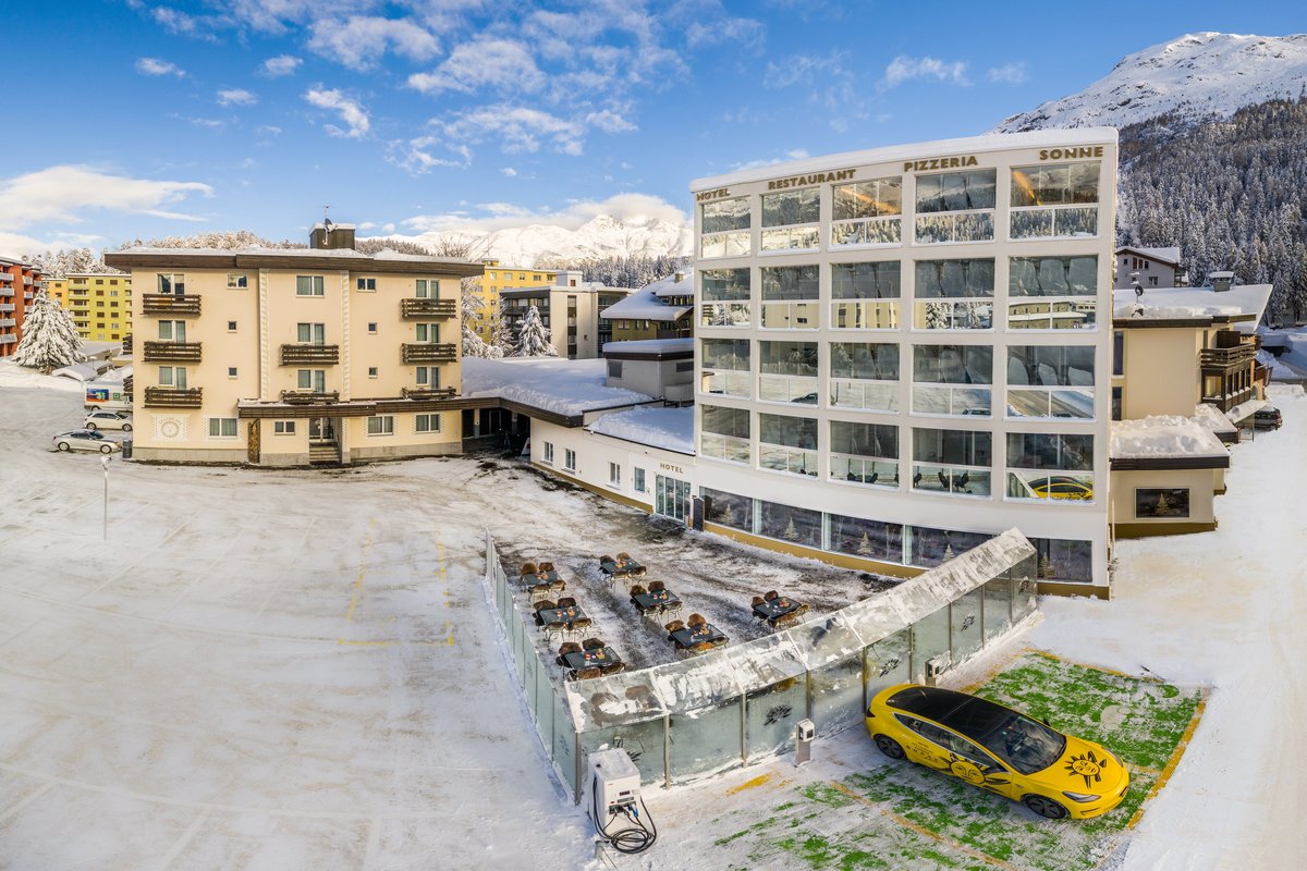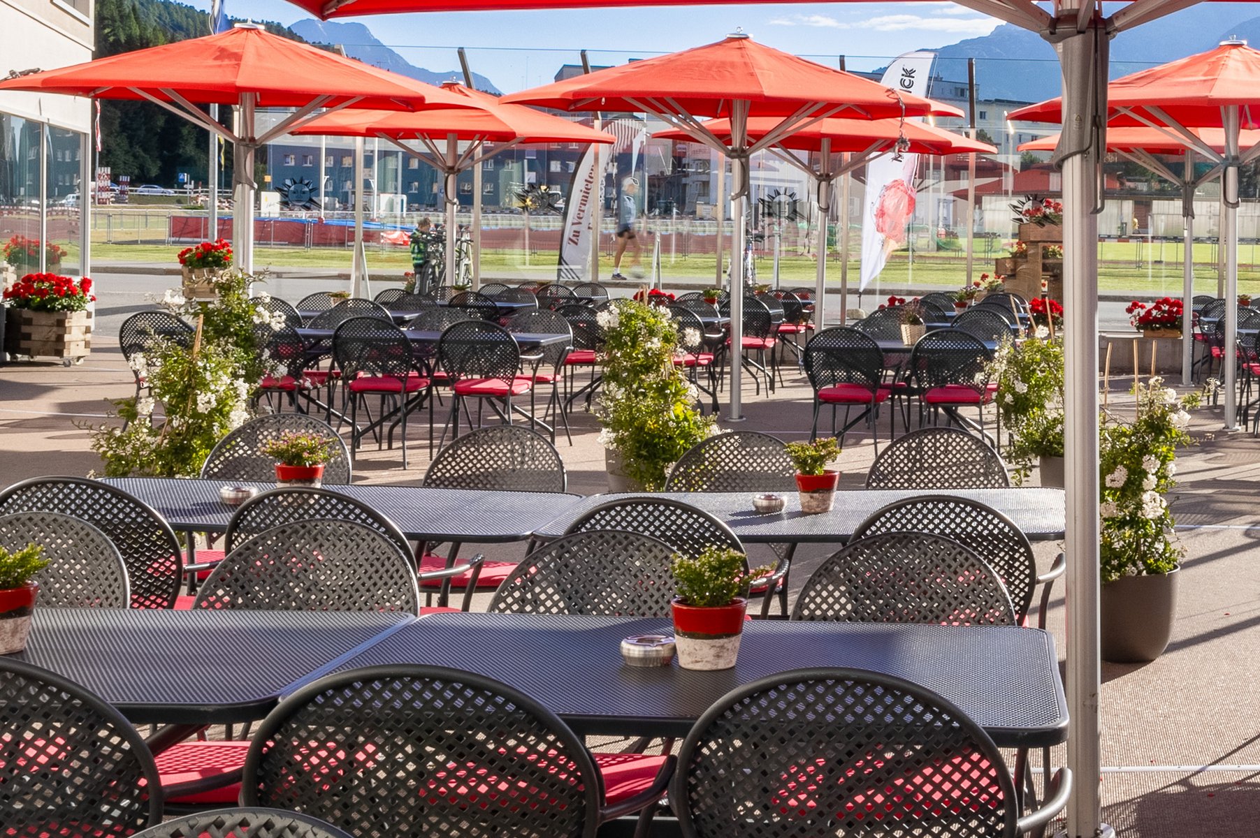 Les derniers rayons de soleil sur St. Moritz réchauffent la vaste terrasse, qui devient alors un lieu de rencontre pour les habitants autour d’un apéritif.