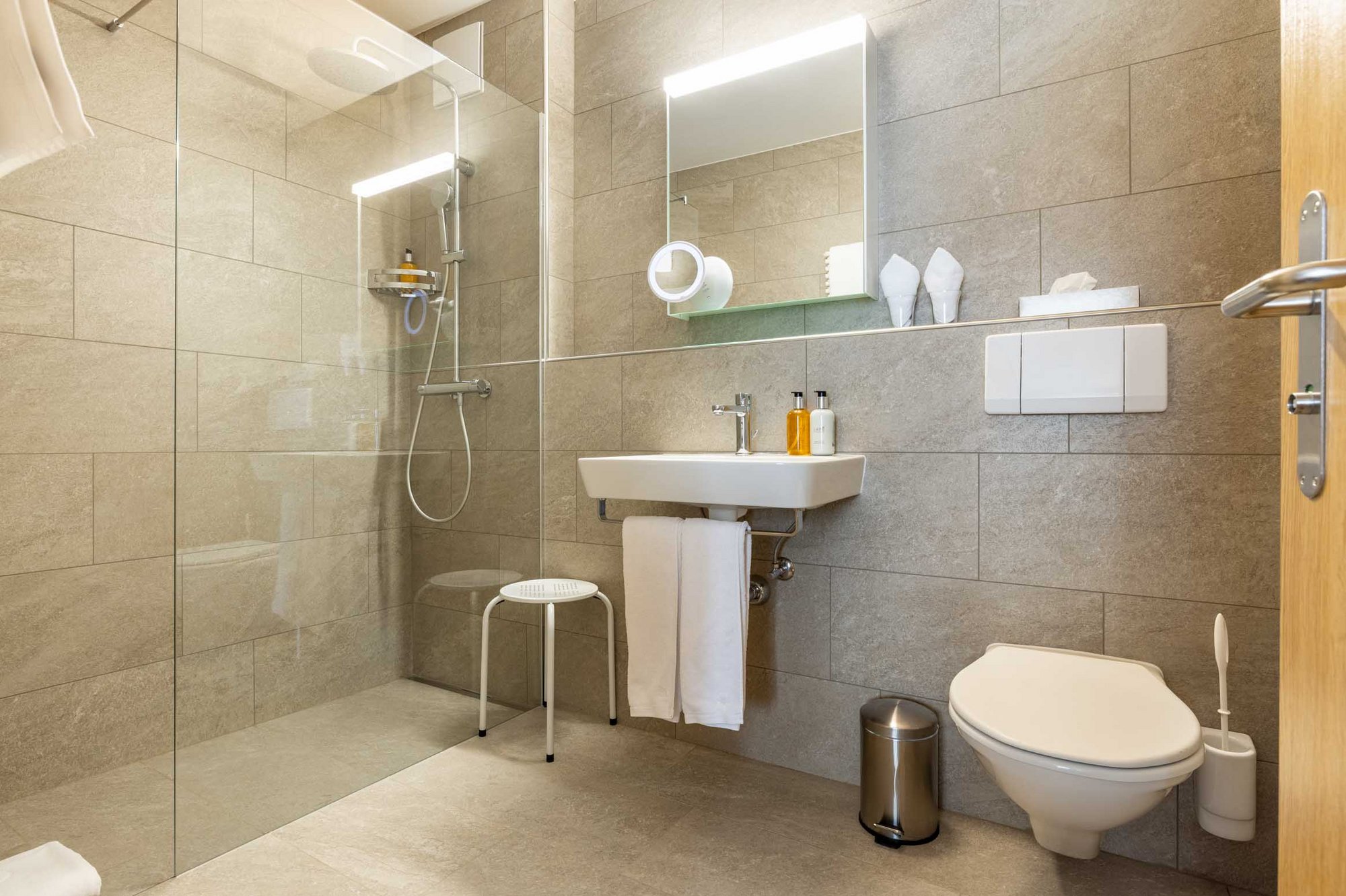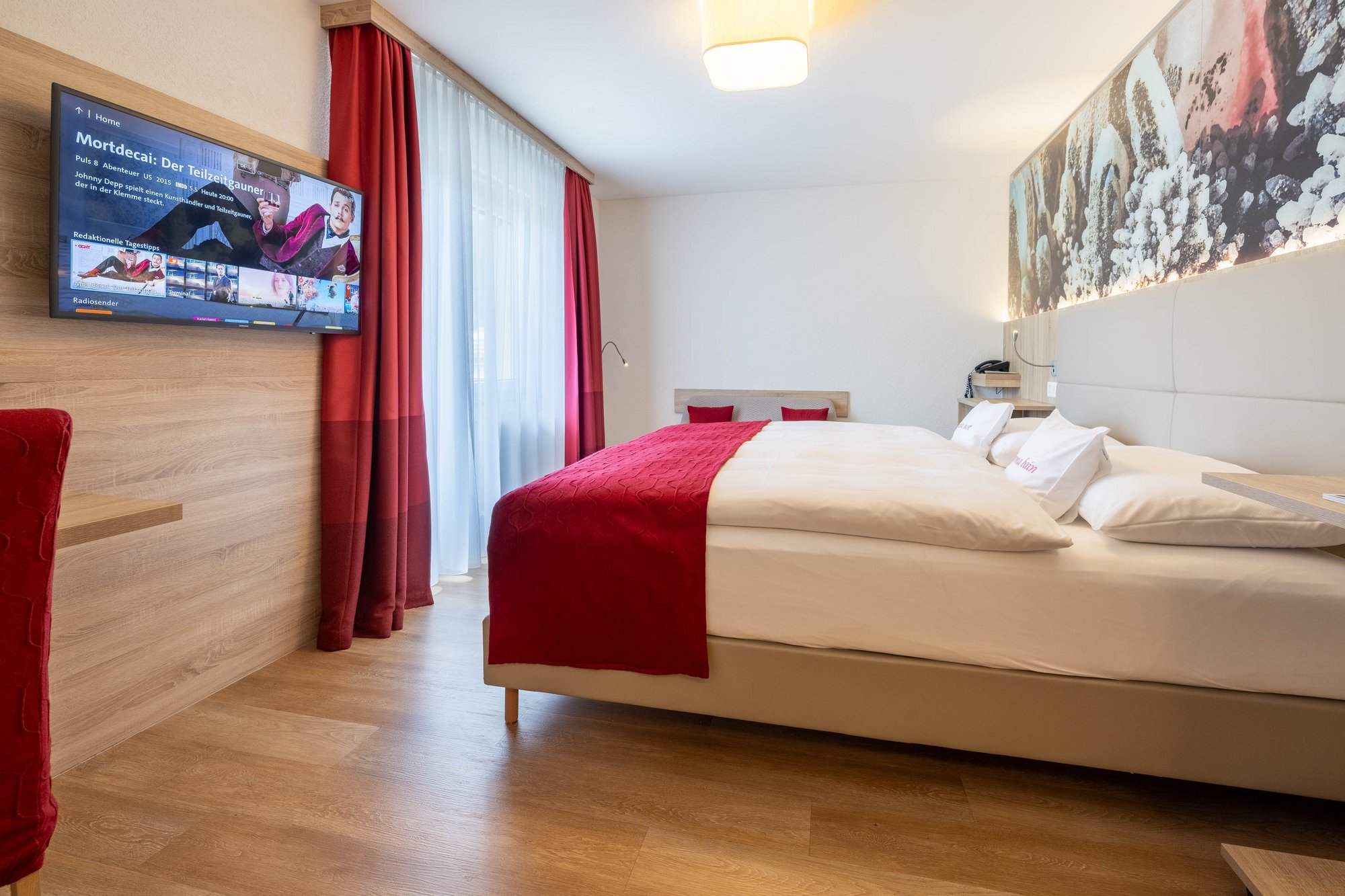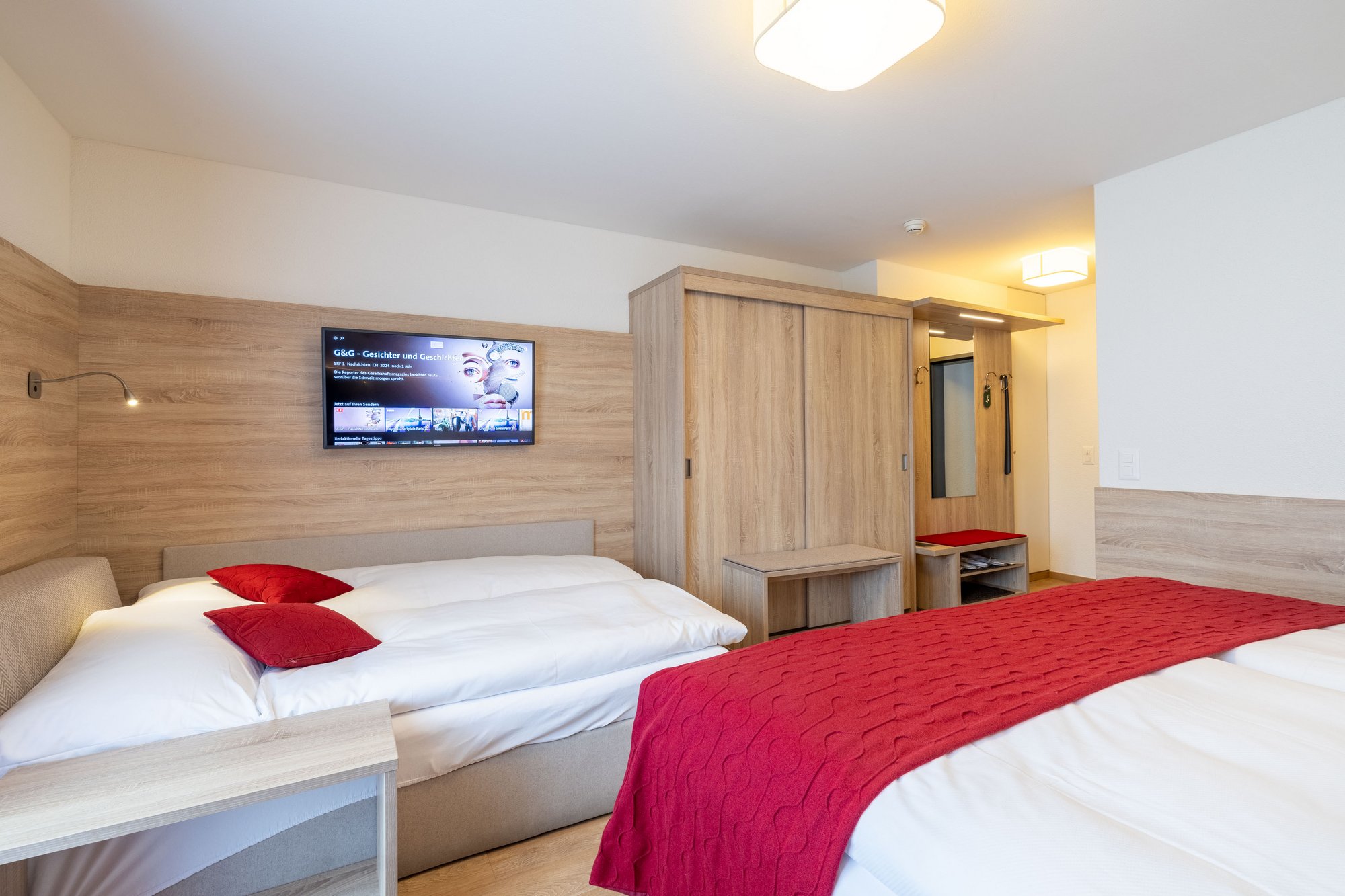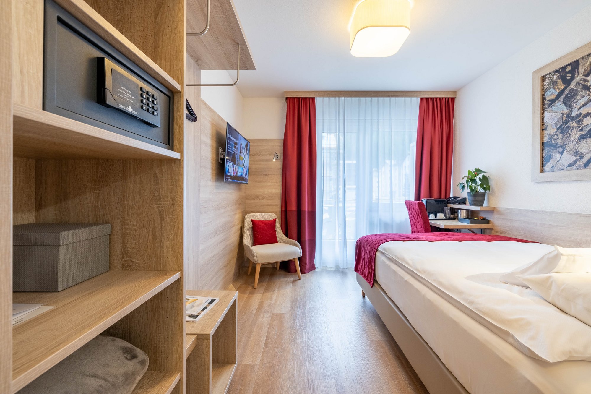 Die Zimmer verfügen über Boxspringbetten in Überlänge 100x220cm, Duvet mit 90% weisse Gänsedaunen (auf Wunsch Anti-Allergiker Bettinhalt), Kopfkissenmenu,43“ TV mit 80 TV Programmen in 8 Sprachen und 12 Radioprogrammen, gratis WIFI, Tresor, Kaffeemaschine mit Teefunktion und Kaffee-/Teesortiment, Tisch und ein Stuhl. Das grosszügige Badezimmer ist mit Badewanne, WC und Fön ausgestattet.