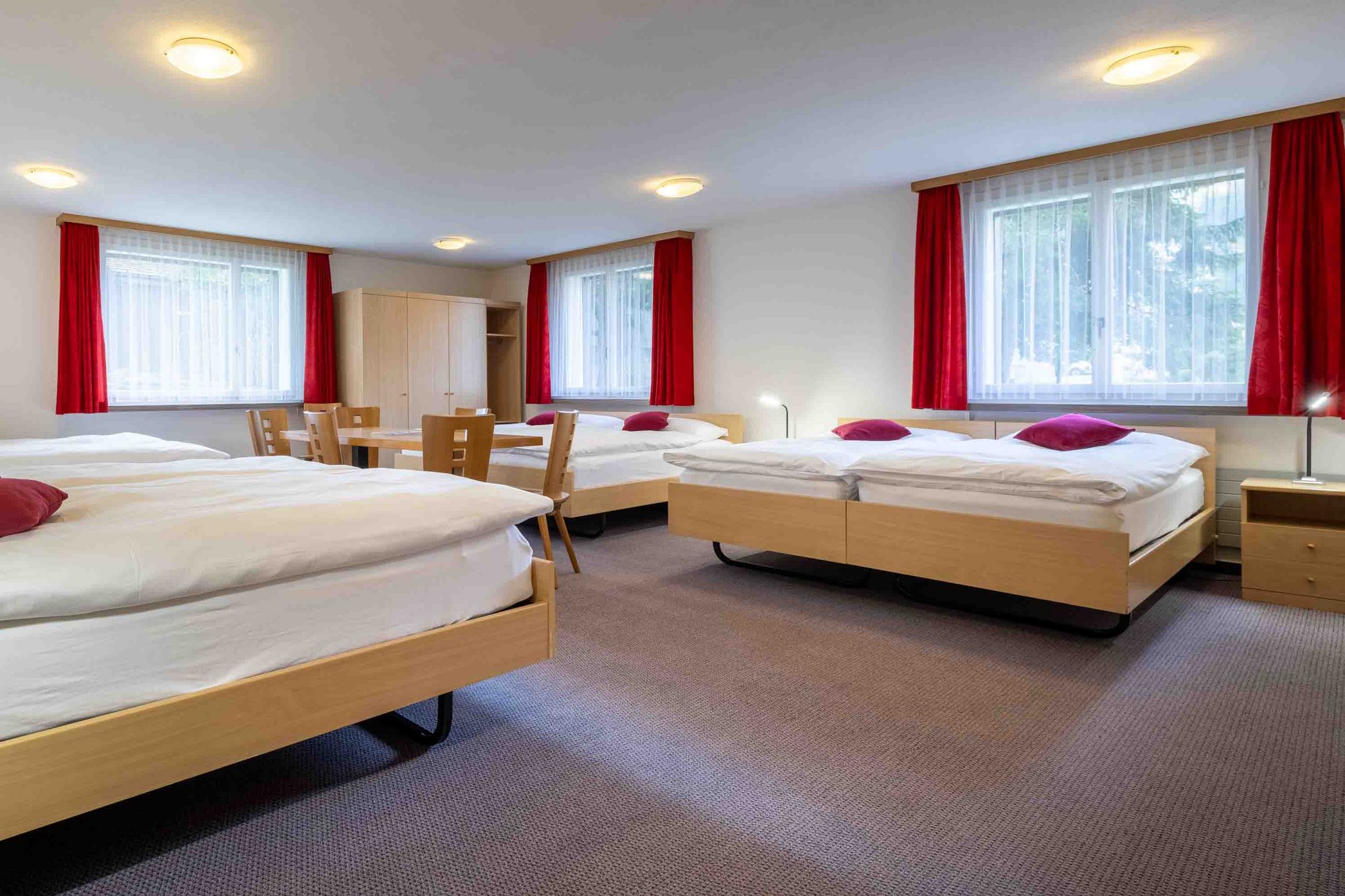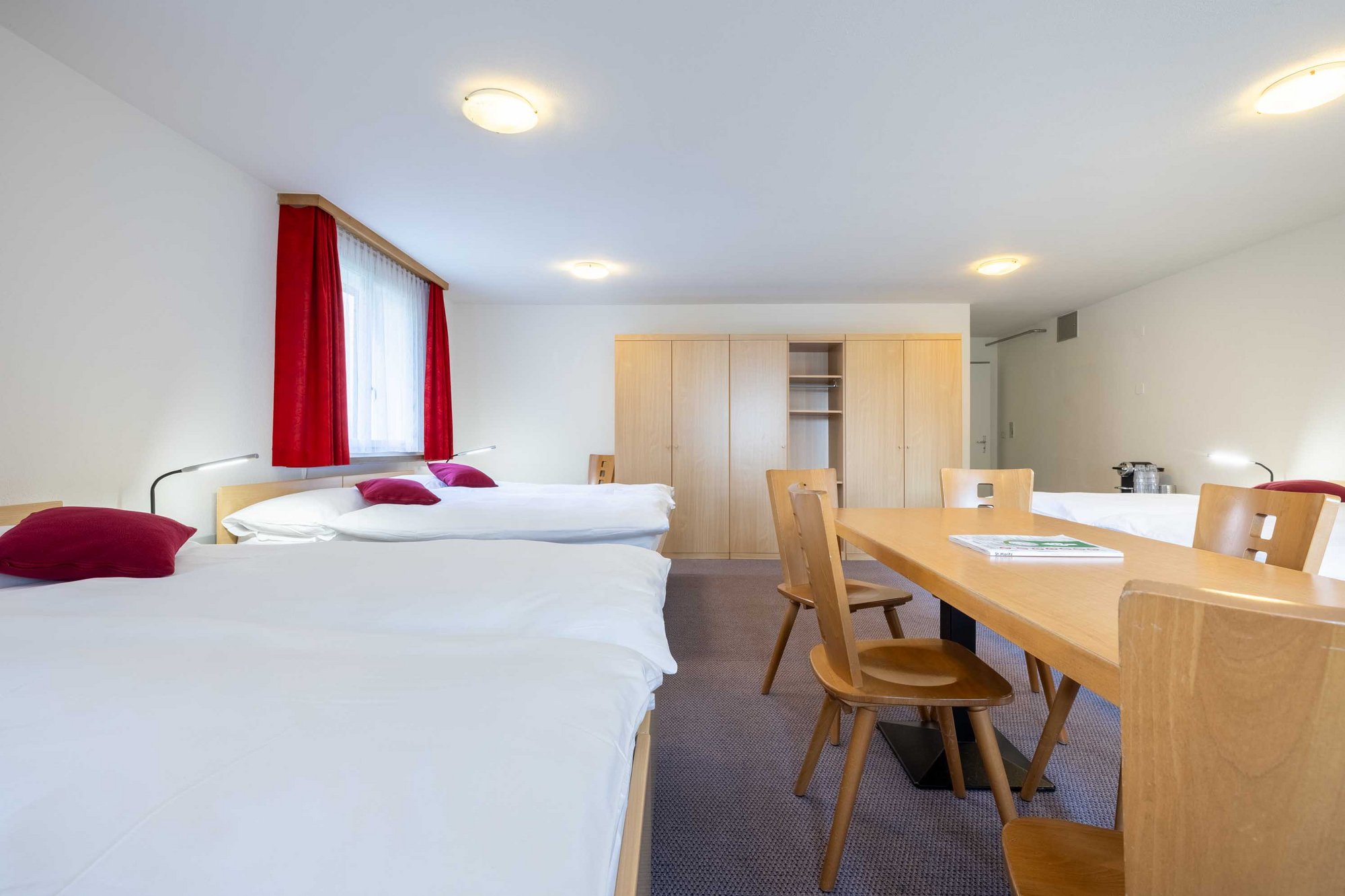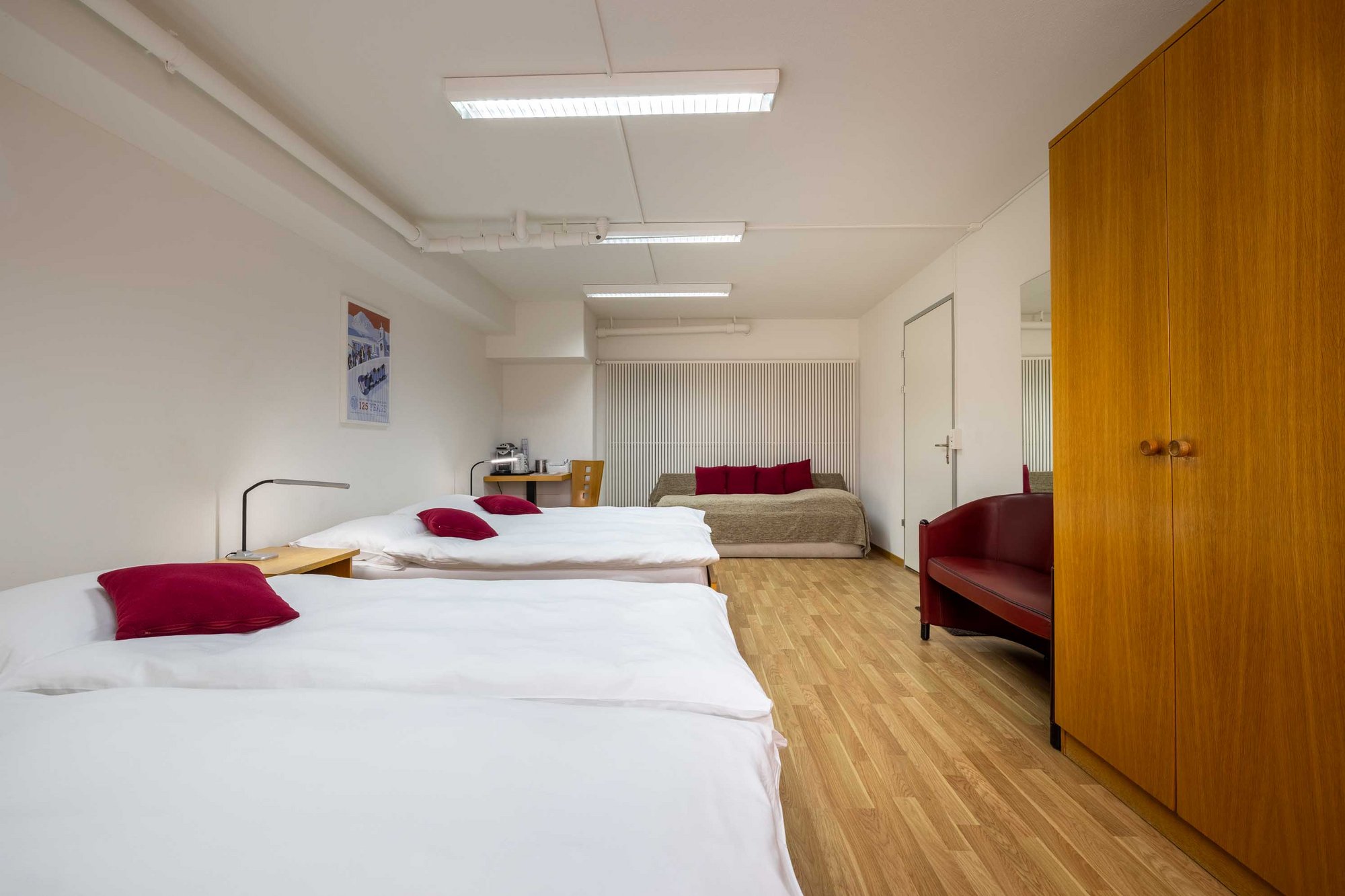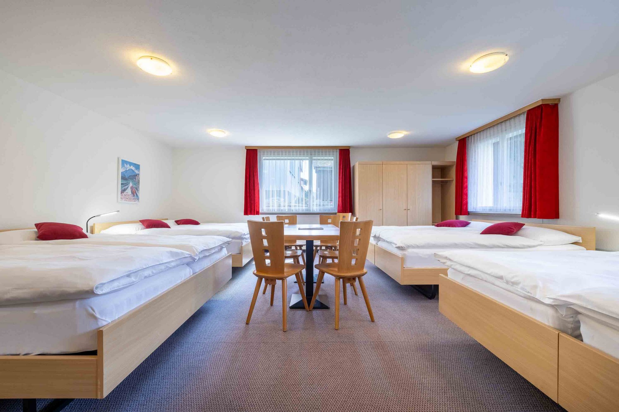 Hier können Sie zwischen Einzel- bis Vierbett-Zimmern mit Badewanne oder Dusche/WC, Fön, Telefon, gratis WiFi , Fernseher und Radiowecker und grösstenteils mit Balkon oder einfachen Einzel- bis Achtbett-Zimmern mit Etagendusche/WC wählen.